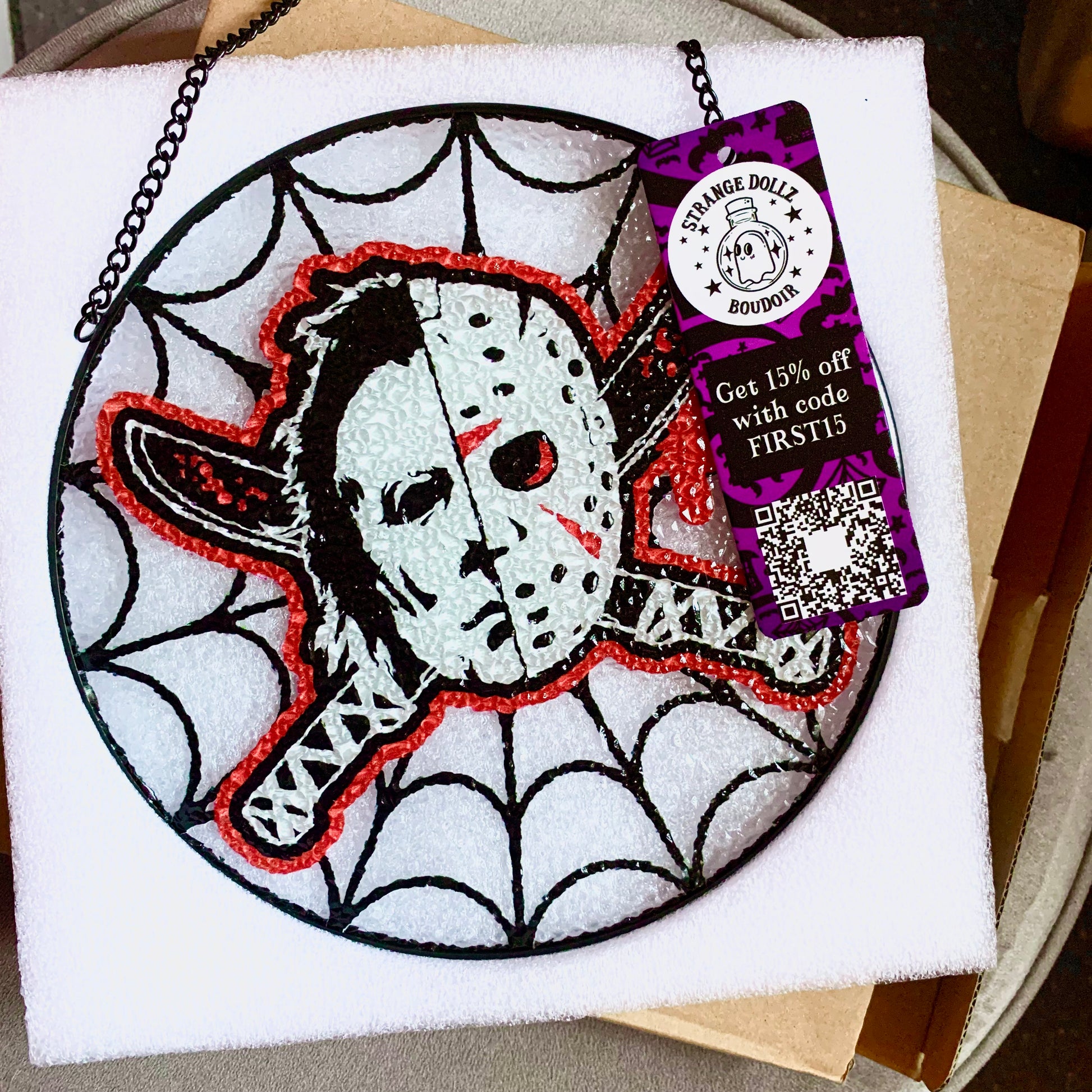 Unleash the Spooky Vibes ! Welcome to the dark side of decor ! Introducing the Jason Voorhees + Michael Myers Glass Suncatcher, a chilling masterpiece, perfect for horror fans who crave a touch of gothic glam !